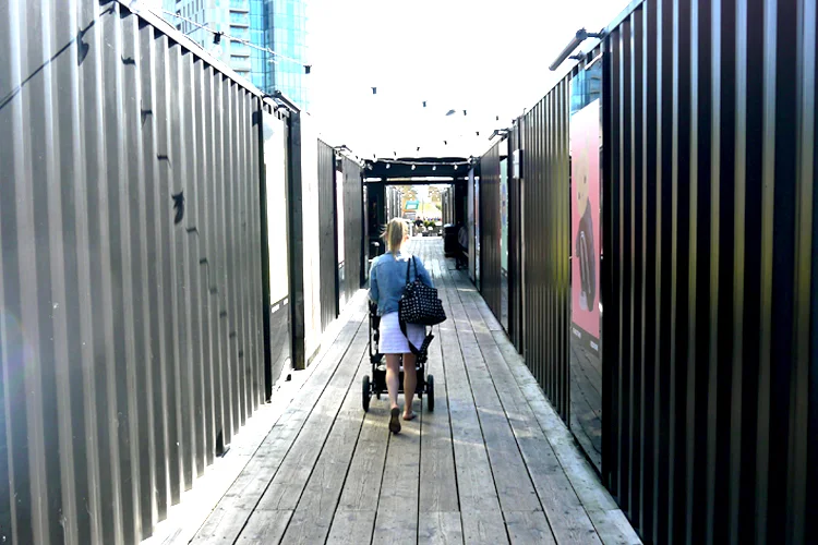 The width and size of a container ship fitted out with clothes racks and other merchandising tables makes it a wee bit tricky to look around with a pram (ok lets be honest, it’s a lot tricky, but hey we make do) and the top level is accessible by stairs only but if you have some muscles with you it’s still worth a look around. I’m sure later on in the evening this little spot would get MIGHTY rowdy but 12.30 pm it’s friendly and inviting, with tables basking in the sunshine.